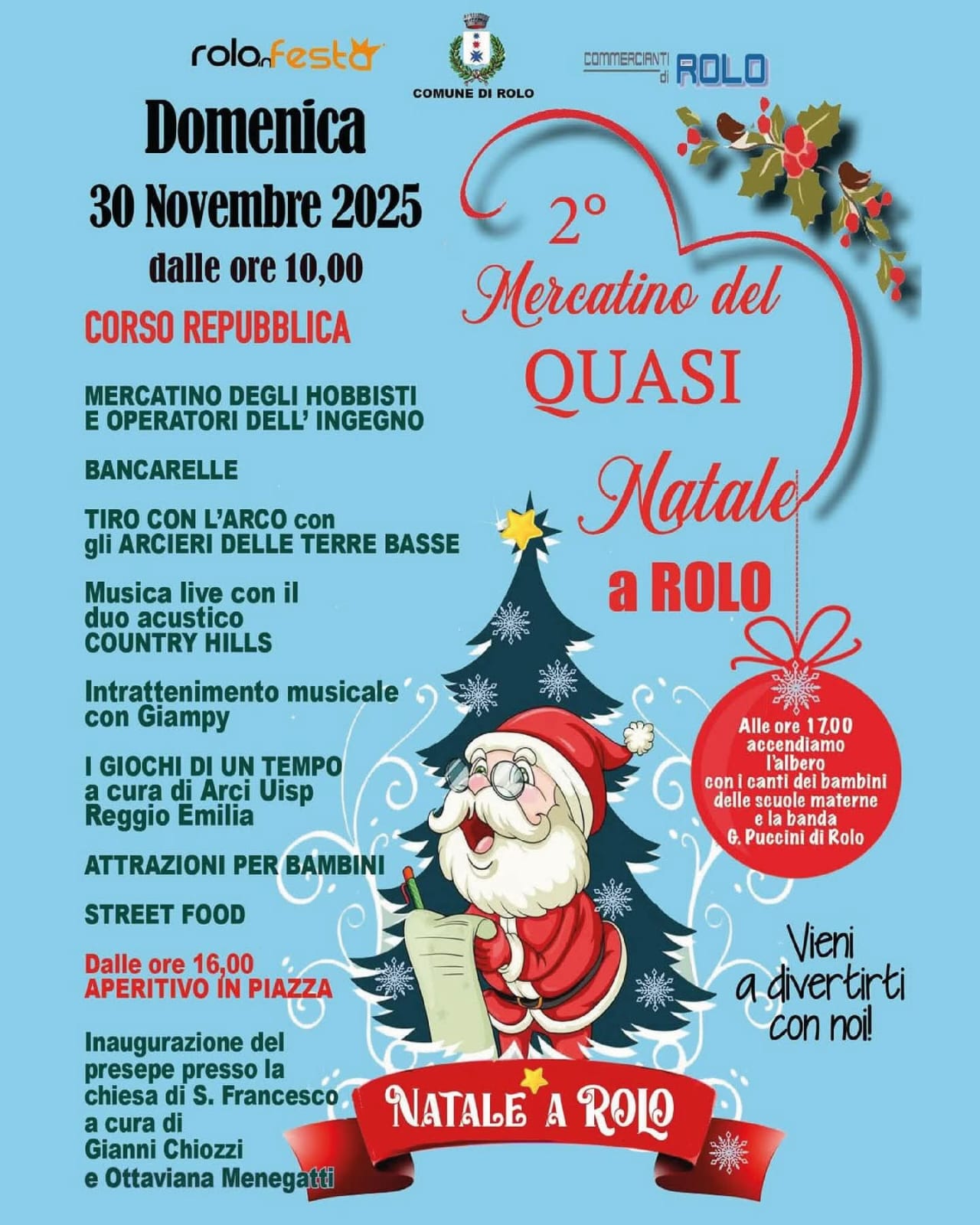 ✨ Alle ore 17.00 accenderemo insieme il grande albero di Natale, accompagnati dai canti dei bambini delle scuole materne e dalla banda G. Puccini di Rolo: un momento magico da condividere con tutta la comunità!