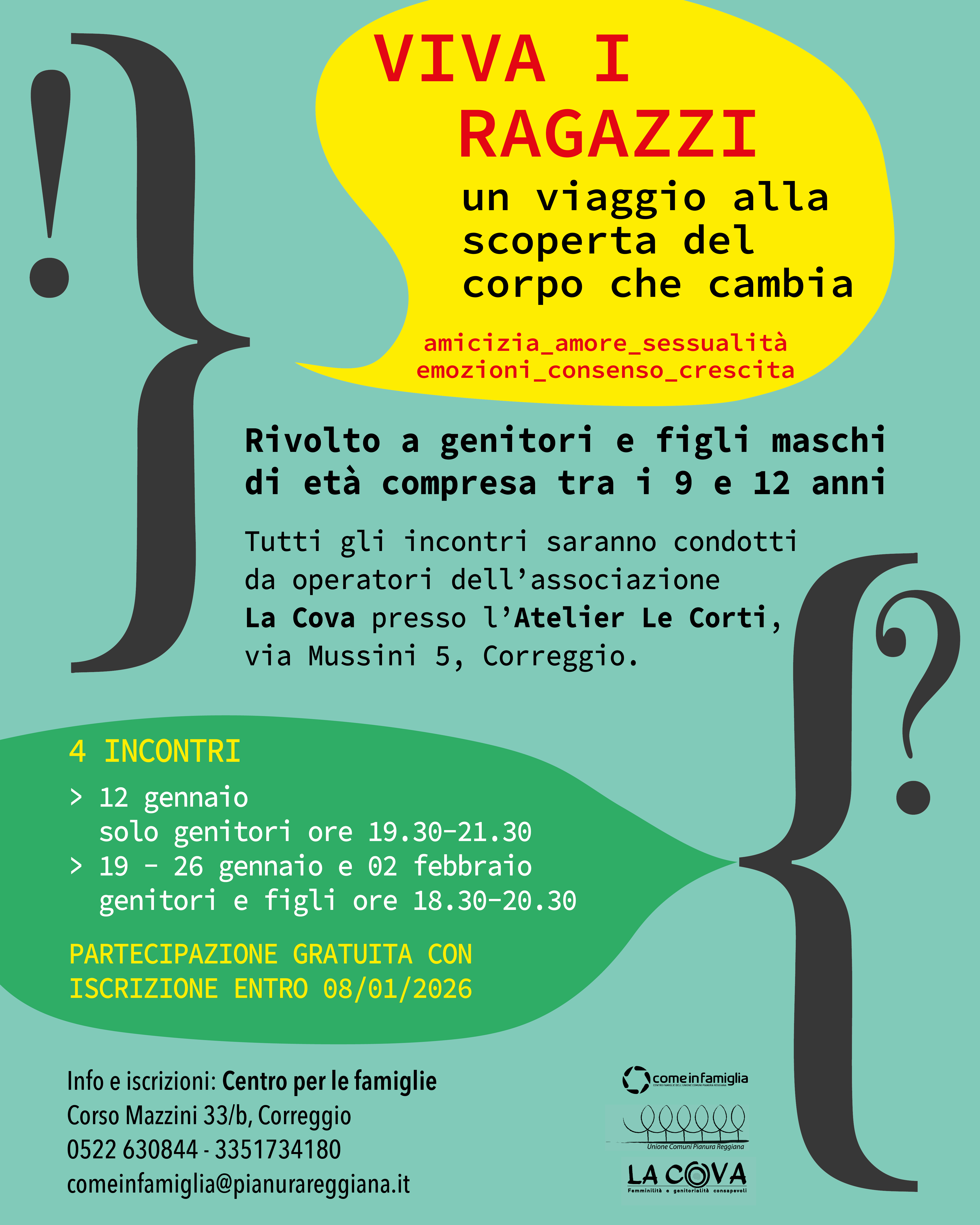 Il Centro per le Famiglie propone “Viva i ragazzi”, un percorso articolato in quattro incontri dedicato a genitori e figli maschi di età compresa tra i 9 e i 12 anni, pensato per accompagnare bambini e adulti in un viaggio di scoperta del corpo che cambia, delle emozioni e delle relazioni.